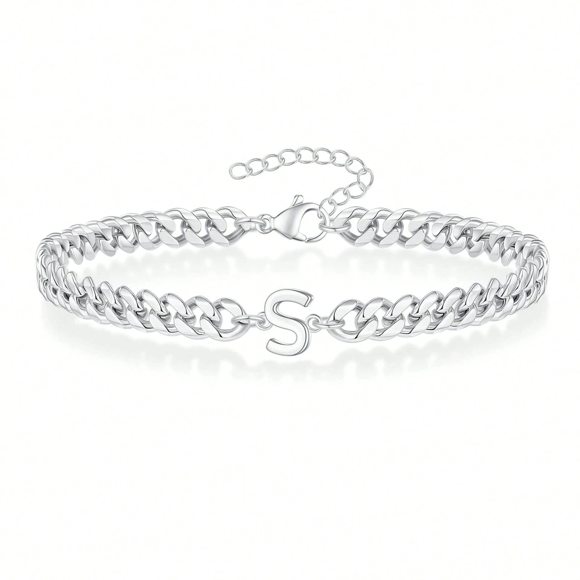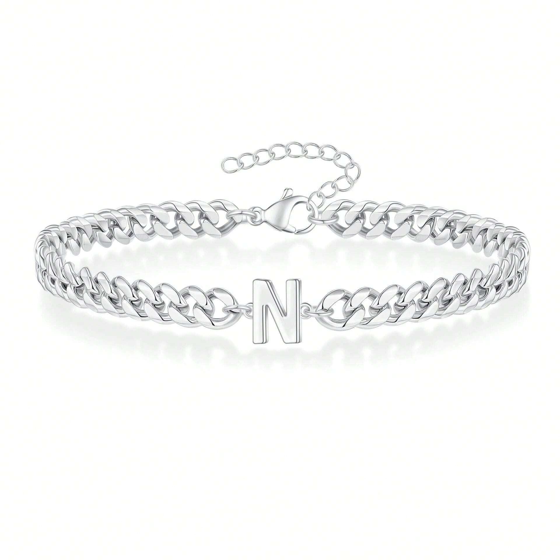 A bold curb chain bracelet with a sleek initial at its center. Its polished gold/silver finish creates a statement piece that's both elegant and personal.